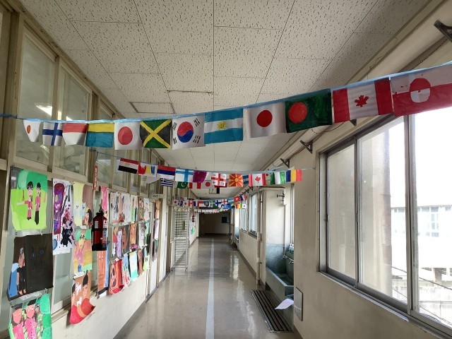 5年生の廊下には万国旗が飾られ、運動会気分満点です。