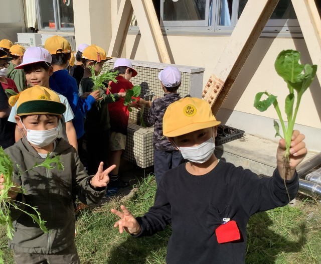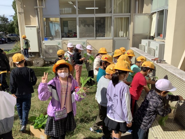 収穫した水菜や小松菜は、家庭に持ち帰りました。自分たちで種から植えて育てた野菜の味は、きっと特別なものになったことだと思います♪