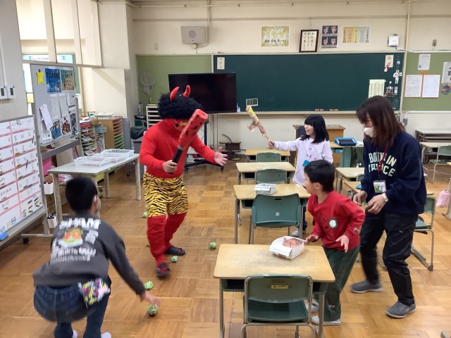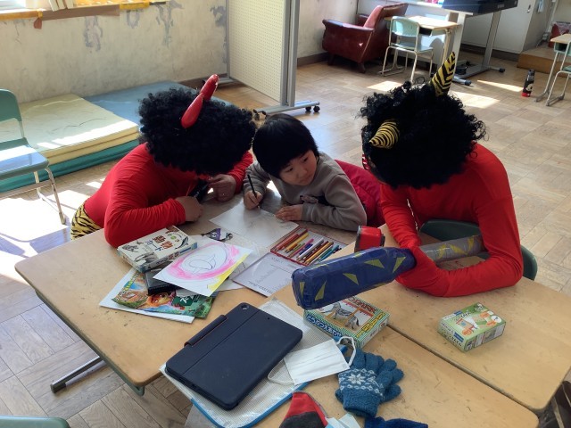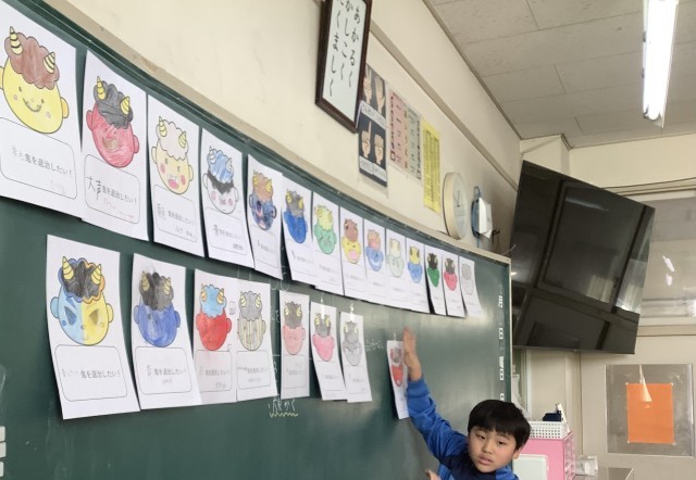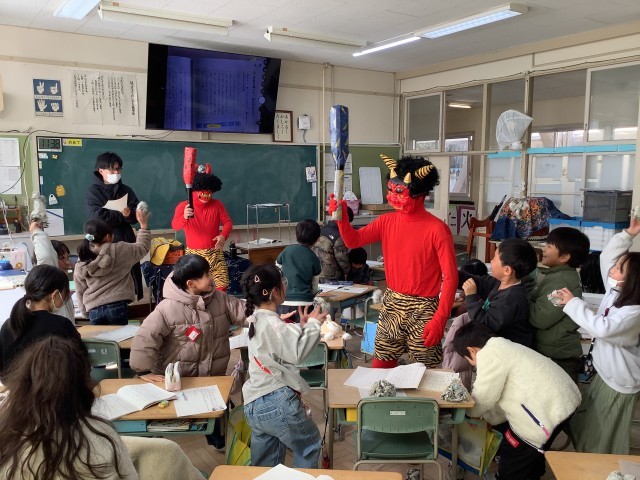 東郷小に現れた鬼さんは、怖いだけではなく、一緒に勉強も教えてくれました。