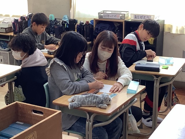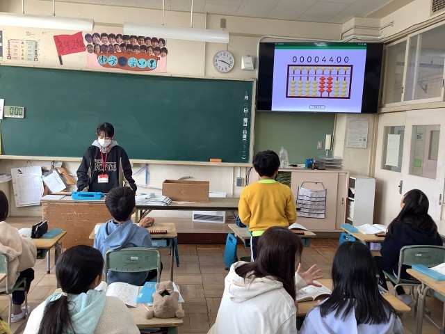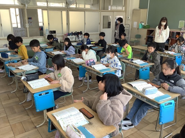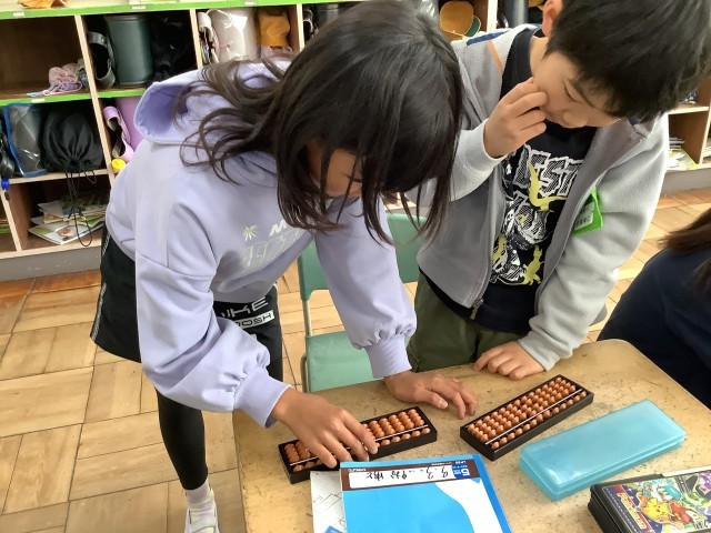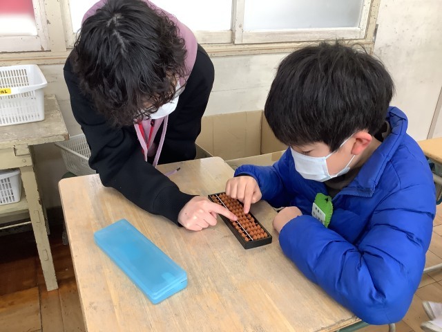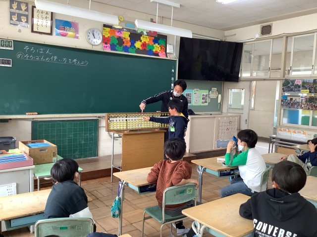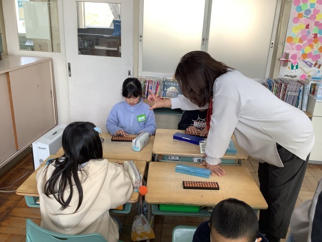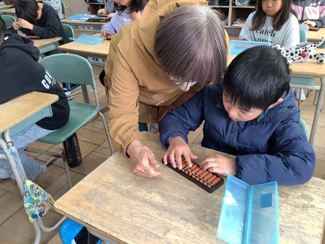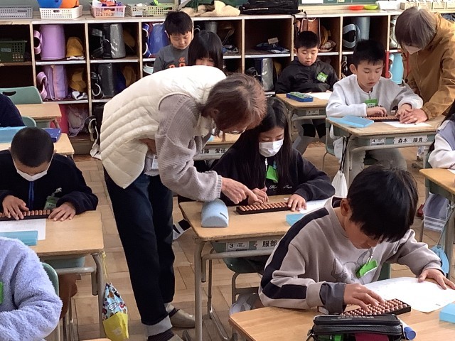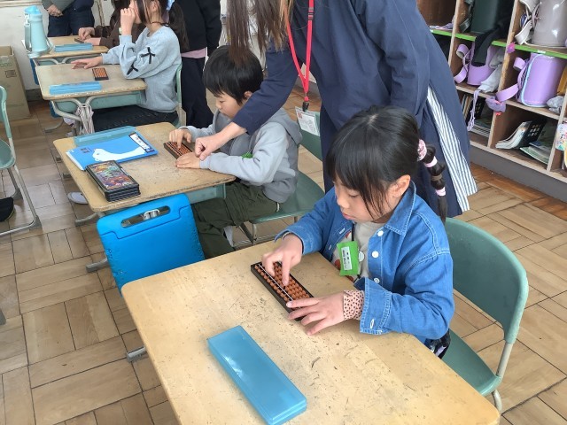 授業には、今年度から「学校運営協議会」での話し合いを通して、ボランティアに名乗りをあげてくださった4人の方がお手伝いにきてくださいました。担任と支援員の先生と4人の地域の方との6人で子供たちと楽しくそろばんを学びました。3時間程度では、なかなかすらすらと指が動くまではいきませんが、玉の動かし方や意味は理解できていたようです。