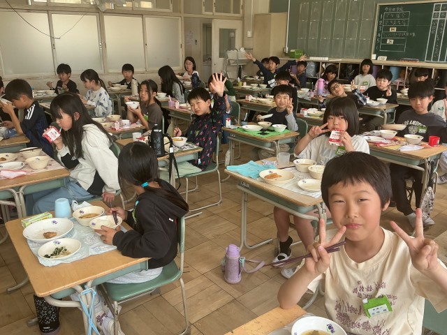 令和8年度の給食が始まりました。久しぶりの給食で、子ども達の笑顔と会話がはずんでいました。給食は成長期の子どもたちの大切な栄養補給源であるとともに、給食の準備から片付けまでの活動を通して、望ましい食習慣を付け、に関する学びを行う大切な時間です。