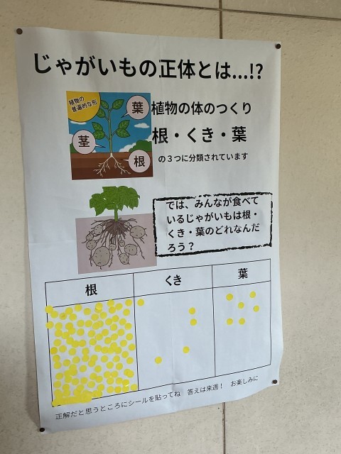 理科室前の廊下におもしろい掲示物を見つけました。じゃがいもの正体は何でしょうか?根でしょうか?くきでしょうか?葉でしょうか?根にたくさんシールが貼ってありますね。正解が楽しみです。