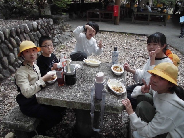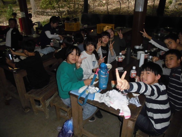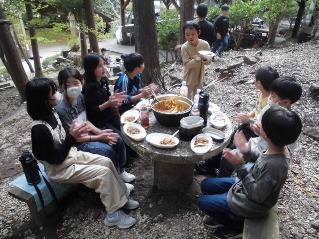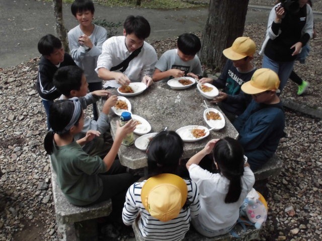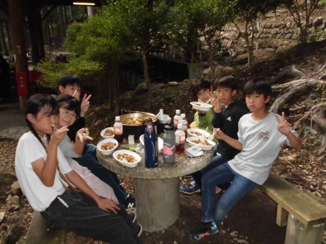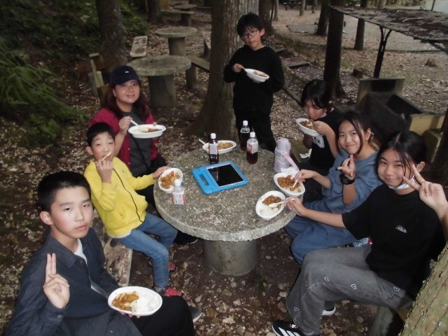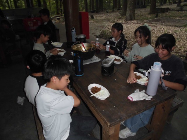 やりました〜。みんな美味しいカレーが食べれたようです。野菜が少々かたいのも、ごはんがちょっとやわらかいのも、キャンプならではですね。みんな、モリモリ食べてました。いただきま〜す!!