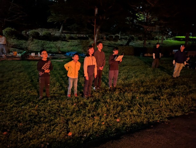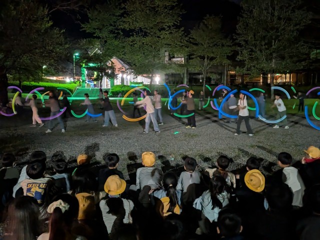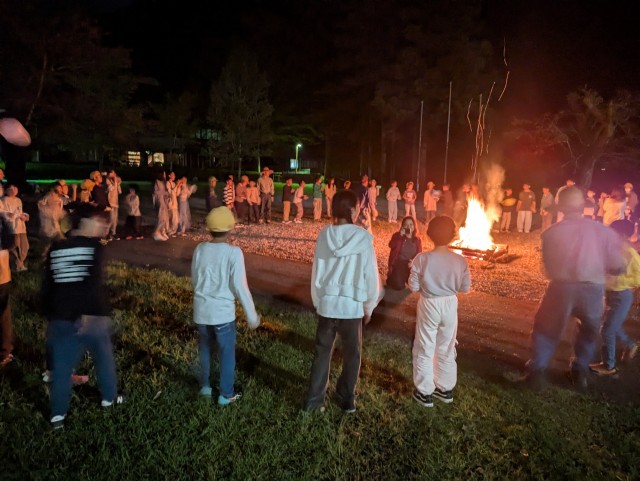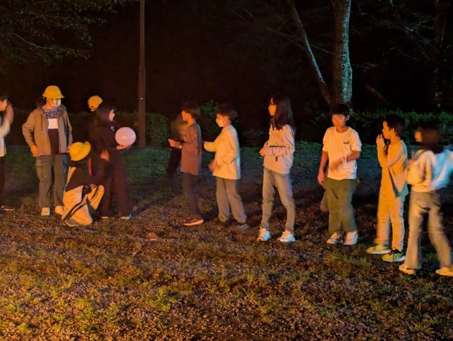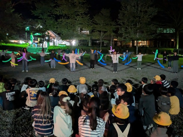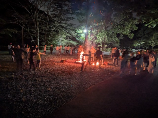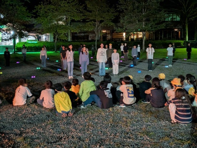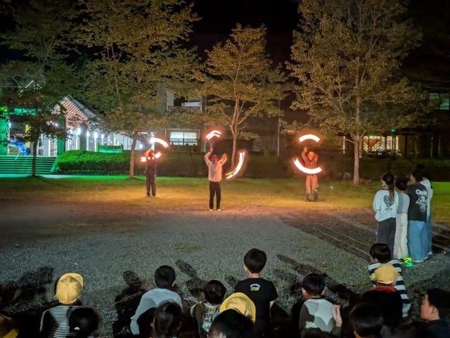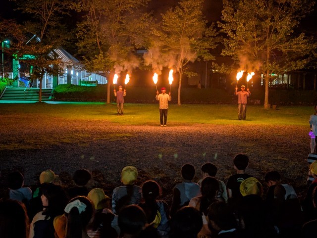 キャンプファイヤーの様子です。ジャンケン列車やクイズ、爆弾ゲームなどで盛り上がり、皆さんお待ちかねのトーチが披露されました。きれいにそろっていてとても上手で、自然と手拍子が起きました。最後には、先生たちからのサプライズもあり、子どもたちは大喜びでした。