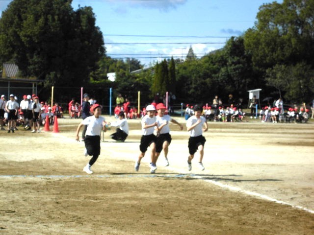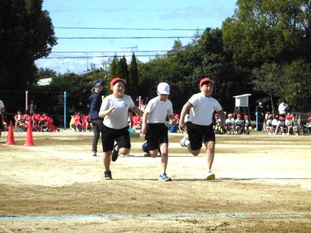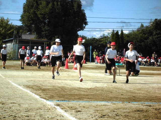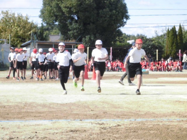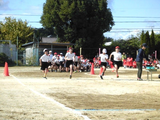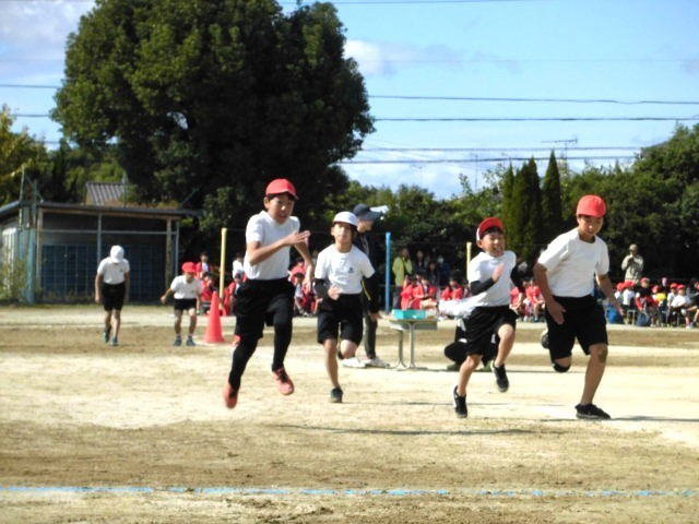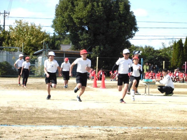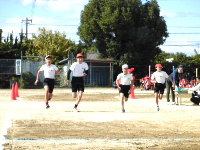 6年生徒競走 さすがは6年生、速い速いっ!!全員が無事に「ゴール」しました。盛り上げてくれてありがとう!