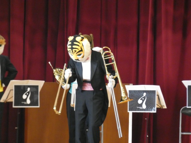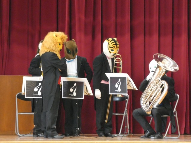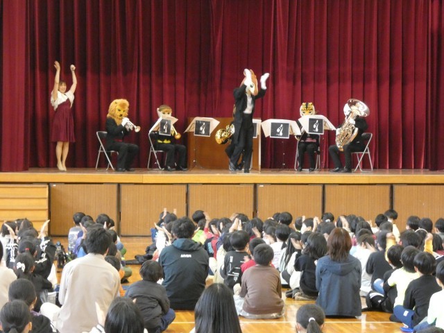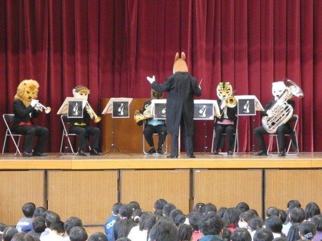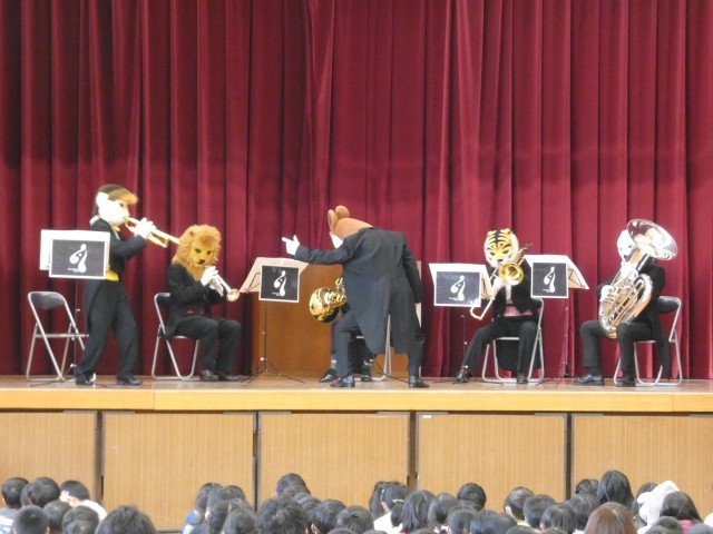本日、芸術鑑賞会が開かれました。今年は、「ズーラシアンブラス」の方々をお迎えし、プロの金管五重奏を聴きました。私は体育館の一番後ろで鑑賞しましたが、とても5人で演奏しているとは思えない迫力と美しい音色でした。子どもたちになじみのある曲が多く、コントのようなやり取りもあり、みんなノリノリでした♪