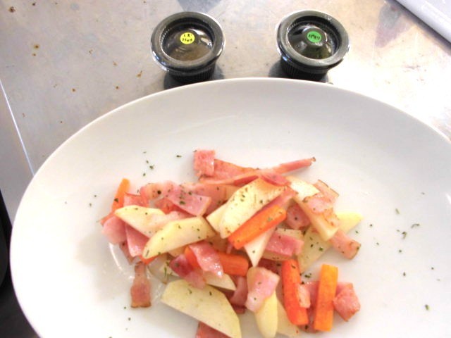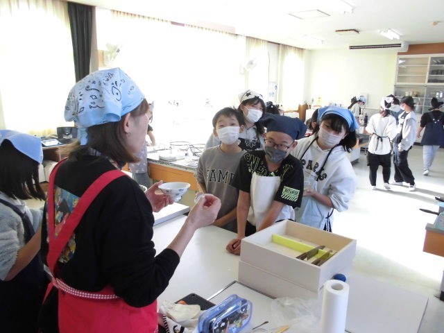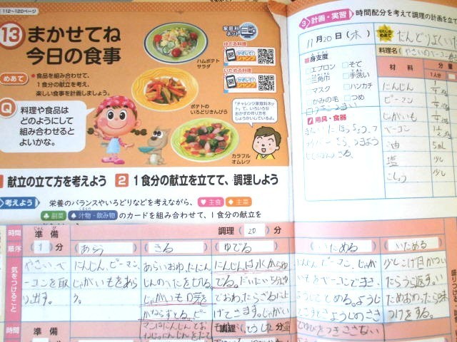 3,4時間目に6-1が調理実習をやっていました。今日のテーマは【茹でて炒める】です。子どもたちは自分が食べたいメニューを考え、自分の分の食材をもってきていました。ピーラーがうまく使えず苦労する子もいましたが、班のメンバーで協力して「野菜のベーコン巻き」や「厚揚げと野菜のチャンプルー」などが次々に出来上がりました。最後は担任の先生が一口食べて評価します(10枚目の写真)。高評価がもらえたかな?!
