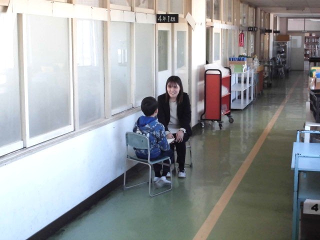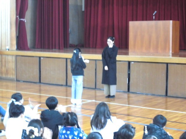 2 ALTとお別れ カトリーナさんがあいさつしました。春小のためにとても一生懸命やって下さいました~!