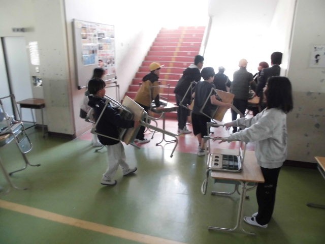 3~ 学活の様子 通知表を受け取り、友達や先生ともお別れです。来年度に向けての机脚移動も行いました。