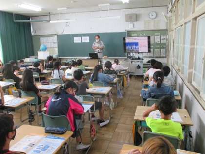 4年生が、「ストップ温暖化教室」をそれぞれのクラスで1時間ずつ行いました。「愛知県地球温暖化防止活動推進員」という方に来ていただき、地球温暖化やエネルギーなどについての話を聞きました。白くなったサンゴや石炭を見せていただいたり、○×クイズを行ったりと楽しく学習することができました。