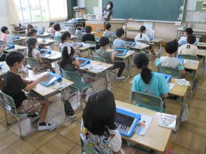 1年生の音楽の授業で、タブレットのピアノを使って学習していました。元気に歌いながらリズムに合わせて音を出していました。