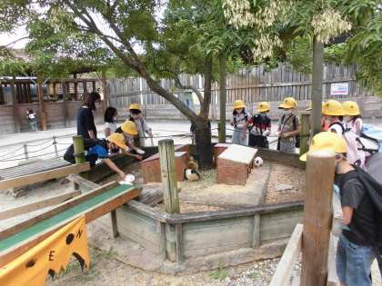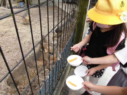 初めての校外学習で、子どもたちは大喜びの様子で、愛知牧場の動物たちととても楽しそうに触れ合っていました。動物にエサをあげたり触れ合ったり、時には追いかけまわしたり…。とにかくみんな楽しそうに過ごしていました。