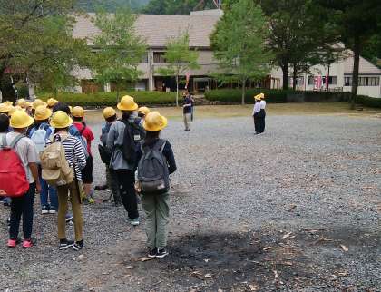 昼食、施設内ハイキングを終え、入村式を行いました。もうすぐポイントラリーです。