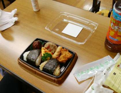 昼食のおむすび弁当を昨日の夕食会場と同じところで食べています。この後は退村式を行って、荷物を積み込みます。