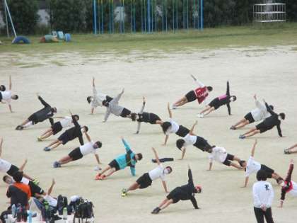 6年生が運動会の演技の練習をしていました。運動場で自分の立つ位置の確認をするとともに、笛の合図とともに一つ一つの動作を確認しながら練習をしていました。本番でみんなの動きが揃うように練習していってください。