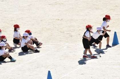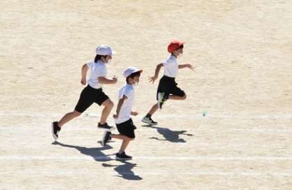 1年生が運動会に向けて徒競走の練習をしていました。全力で走っていました。走り終わった後に整列し、赤が勝った場合、白が勝った場合それぞれ「バンザーイ」と練習する声がとても大きく元気でした。