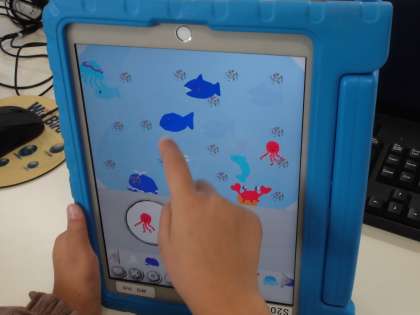 子どもたちはそれぞれ自分たちの好きな絵をかいて、それを増やしたり動かしたりしていました。どの子も楽しそうに一生懸命タブレットを触って授業に臨んでいました。