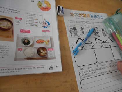 「五大栄養素を知ろう」ということで、それぞれの栄養素が体にどんな働きをするのか、どの食べ物がどんな栄養素であるのかなどを学習していました。「牛乳苦手—」という言葉もチラホラ聞こえましたが、いろいろな栄養素をバランスよく取って元気な体を作ることができるように、好き嫌いなく食べられるといいですね。