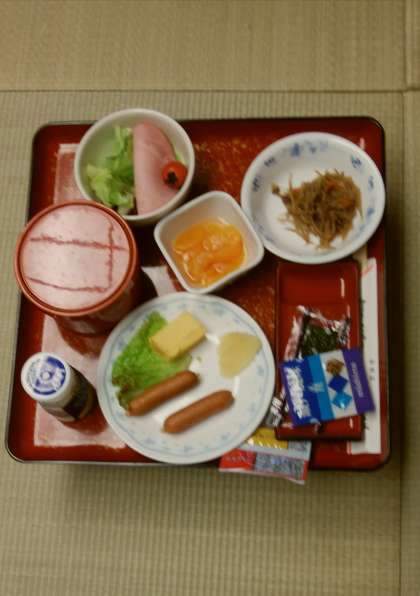 部屋で、朝食を食べています。食べたら部屋の片付けです。