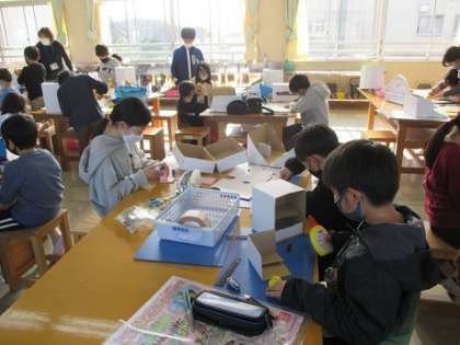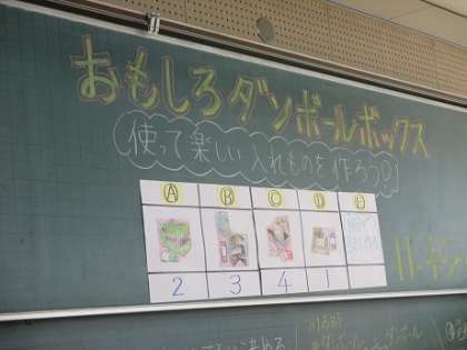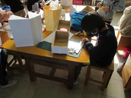 4年生が図工で段ボールで入れ物を作っていました。個々の用途に合わせて、切り込みを入れたり飾りを貼ったりしていました。一人一人の思いが詰まった入れ物ができそうです。どんな入れ物ができるか楽しみです。