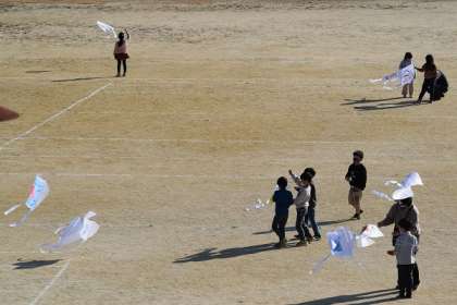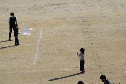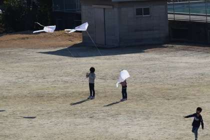 1年生がたこあげをしていました。日差しがある中、程よく風も吹いていてたこあげには良い天気です。一生懸命に走って楽しそうに活動していました。