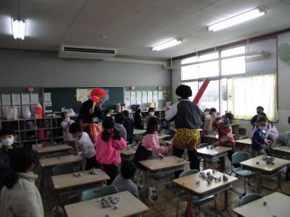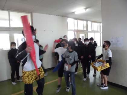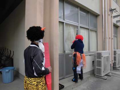 武器を持った2匹の鬼とホームページの写真を撮る1匹の下っ端の鬼がいろいろな教室に出没しました。