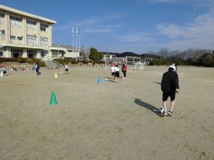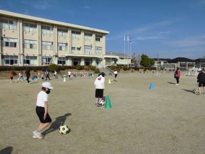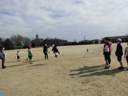 個人での縄跳びや大縄跳び、サッカーボールを使ってドリブルやコーン当てなど、前日の雨で地面が状態はよくありませんでしたが、楽しそうに体を動かしていました。