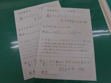 担任外の先生に放送委員がアンケートを配り、お昼の放送で、その曲にまつわるエピソードが紹介された後、曲が流れています。