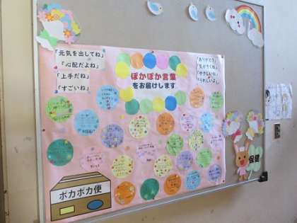ぽかぽか言葉 公開日 2023/02/17 更新日 2023/02/17 お知らせ 南館1階に保健委員会が作成した「ぽかぽか言葉をお届けします」というタイトルの掲示があります。「いっしょに遊んでくれてありがとう」「いつもおいしいご飯を作ってくれることに感謝」など、友達や家族への感謝の気持ちが書かれたメッセージが貼ってありました。他人に感謝する気持ちをもつと自分もあたたかい気持ちになれますね。