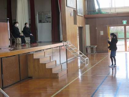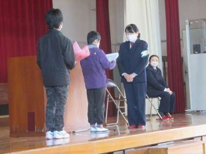 朝会の時間に、交通指導員の2名に来ていただき感謝の会を行いました。児童会長がお礼を言ったり、代表児童が手紙を読んで手紙と花束を渡したりしました。指導員のお二人にもお言葉をいただきました。何よりも全校みんなの拍手があたたかかったです。一人一人が交通安全に気をつけ、元気に指導員の方にあいさつをするといいですね。今日のこの会のために児童会と代表児童の皆さん準備ありがとうございました。