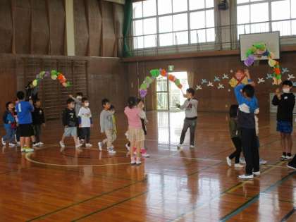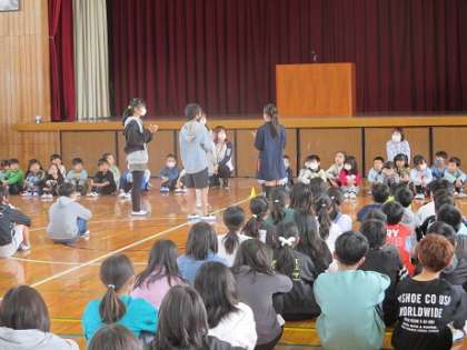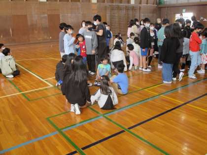 朝の時間に5・6年生と1年生が体育館で1年生を迎える会を行いました。猛獣狩りゲームでは、高学年と1年生が混じり、言葉の数の人数がそろったら座りました。1年生に感想を聞いたら楽しかったと言っていました。児童会の皆さん、そして5・6年生の皆さんありがとうございました。