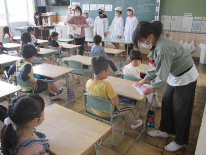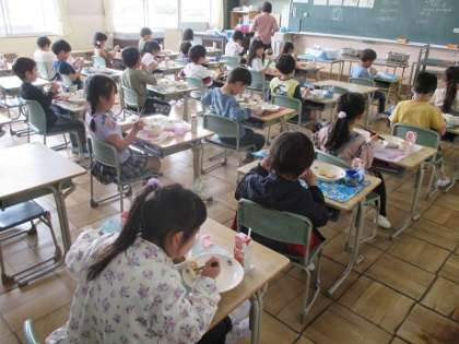 今日から一年生の給食が始まりました。6年生が一年生の教室にやってきて、配膳をしてくれたおかげで早く食べ始めることができました。ありがとうございました。おいしそうに食べていましたね。一年生のみんなはしっかりと配膳の仕方を見ていたかな。もうすぐ自分たちで配膳もやらないといけませんね。