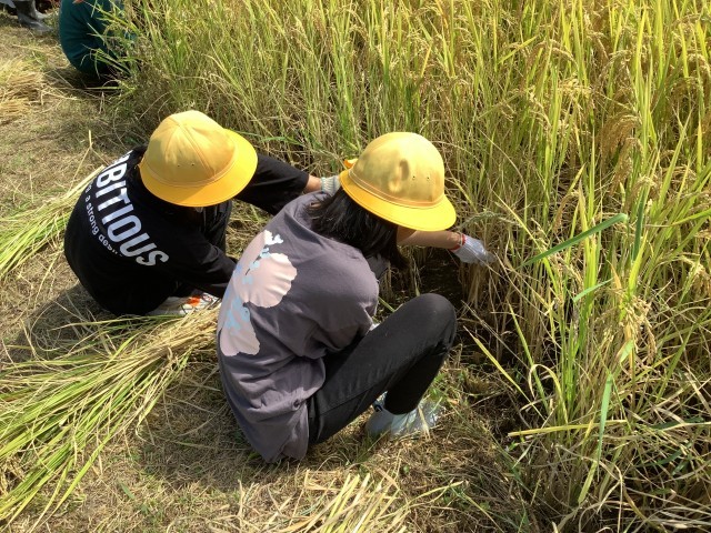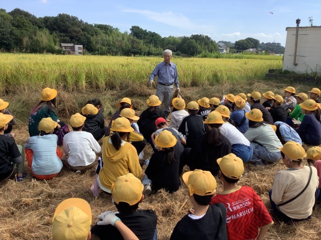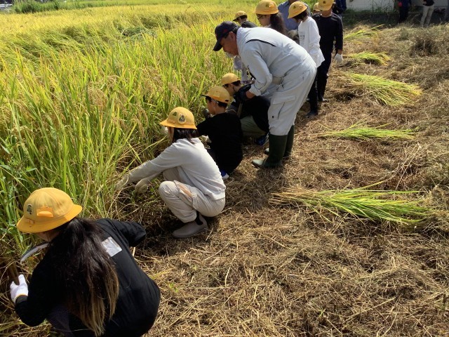 社会科の学習の一環として、9月24日(水)に5年生が稲刈りを体験しました。地域の方から説明を聞き、鎌を使って稲を刈りました。