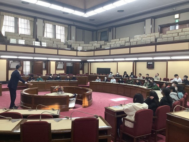 また、名古屋市議会の議場を見学させていただき、議場の歴史や特徴について教えていただきました。