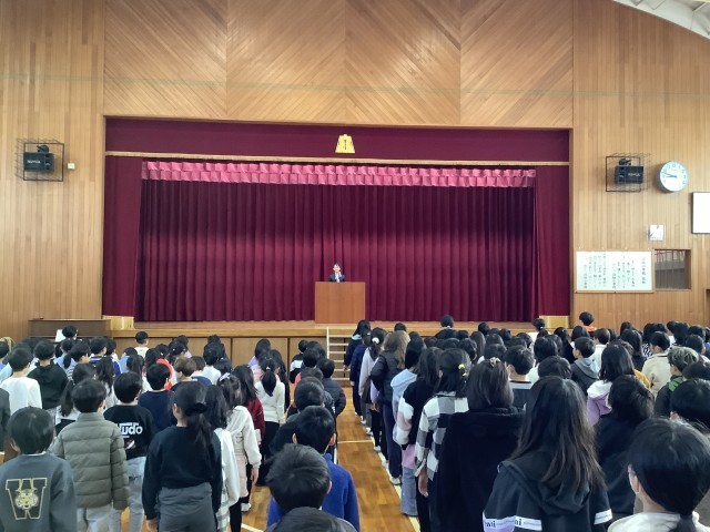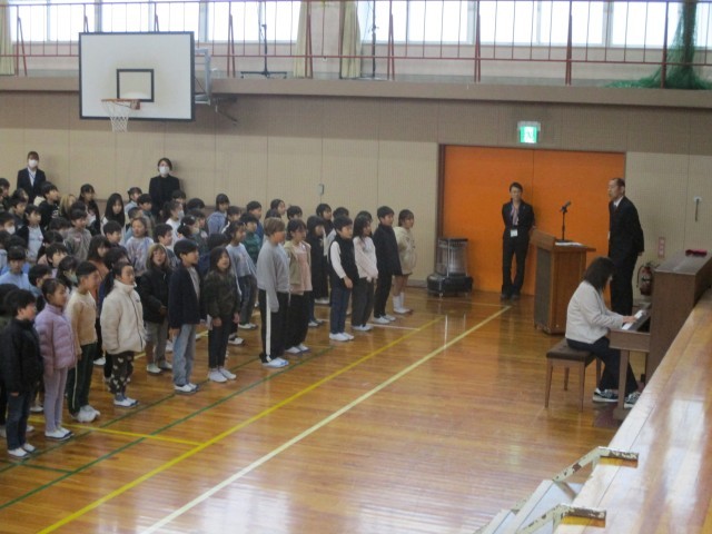 校長先生からは、『2学期の始業式に「何か熱中するものを見つけよう」と話しましたが、どのようなことに熱中しましたか。』といったお話があり、それぞれの児童が2学期を振り返りました。生活指導担当の先生からは、お金の使い方など、冬休みの過ごし方についてのお話がありました。