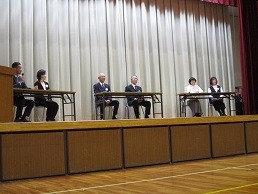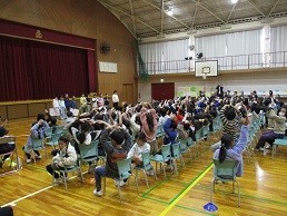 11月14日(金)、音貝小学校創立50周年記念行事が行われました。青空の下、2限に運動場で航空写真を撮りました。そして3・4限には、町長や教育長、地域の方、保護者の皆さんを招いて体育館で記念行事を行いました。校長あいさつ、町長・教育長の祝辞のあと、50年の歴史を知る地域の方をパネリストに迎え、昔の音貝小学校や周辺の様子、学校生活などについてお話を聞きました。6年生は、総合的な学習の時間に取り組んできた音貝小学校の50年周年を祝う様々なプロジェクトについて発表をし、合唱を披露しました。また幕間には3年生が総合的な学習の時間で調べてきた50年の歴史について、クイズ形式で発表し、会場が盛り上がりました。そして最後はみんなで校歌を歌いました。