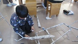 図画工作科の「組んで立ててつなぐんぐん」の学習では、新聞紙を丸めて作った棒を使って、自分の思い浮かべた立体になるように工夫を凝らしながら取り組むことができました。