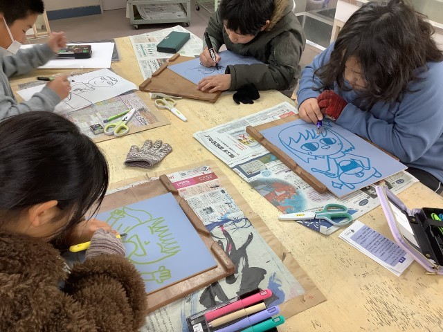 図画工作科の「ほってすって見つけて」の学習では、木版画に取り組んでいます。初めて使う彫刻刀に緊張した面持ちです。どんな掘り方をすると、どんな作品になるのか想像力をはたらかせながら作品作りに奮闘中です。
