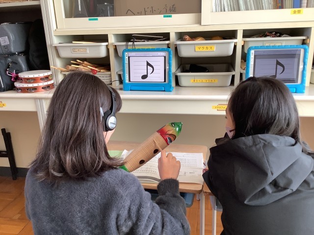 音楽科の「ラ クンパルシータ」の学習では、合奏に向けて練習に励んでいます。普段使っているリコーダーや鍵盤ハーモニカ以外にも、木琴や鉄筋、ギロ、太鼓など様々な楽器に触れる機会になっています。