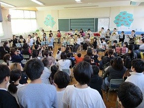 3月4日(水)、金管バンド部のお別れ演奏会が行われました。4年生から6年生の全部員で、「RPG」「宝島」の2曲を演奏しました。保護者の方、先生、他の部活動の児童の前で、立派な演奏をしてくれました。