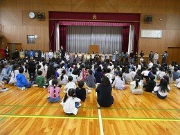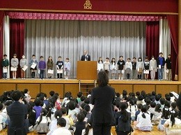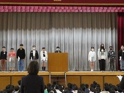 そのあと、校長先生のお話の中で、4月生まれの子が前に並び、何人かの子ががんばりたいことを発表した後、全校児童でハッピーバースデーの歌を歌いました。