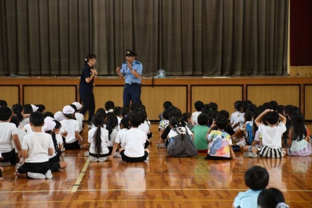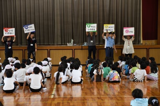 9月19日(金)に、不審者を想定した避難訓練を行いました。愛知警察署の方が「不審者役」となって、教員が確保する形で行いました。子どもたちは体育館への避難後、警察の方から「防犯の合い言葉 つみきおに」についての話を聞きました。今回の避難訓練を通して、子どもたちは安全に対する意識をより一層高めることができました。