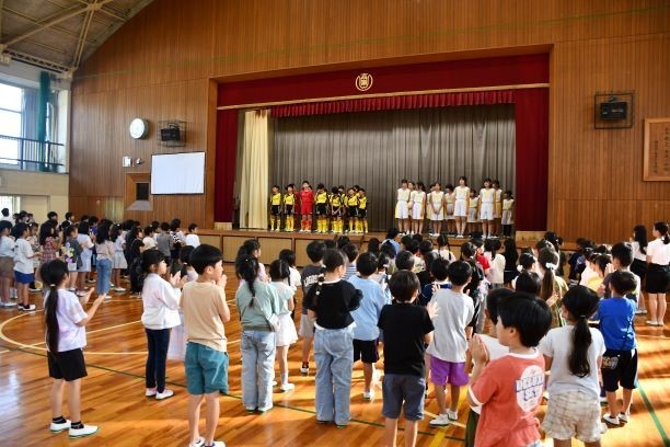 10月17日(金)に球技大会の壮行会が行われました。バスケットボール部とサッカー部の選手たちはユニフォーム姿でさっそうと入場し、全校児童から大きな拍手で迎えられました。それぞれのキャプテンからは、大会に向けての意気込みが語られ、全校児童から激励されました。18日(土)に大会が行われますので、これまでの練習の成果を発揮してがんばってきてほしいと思います。