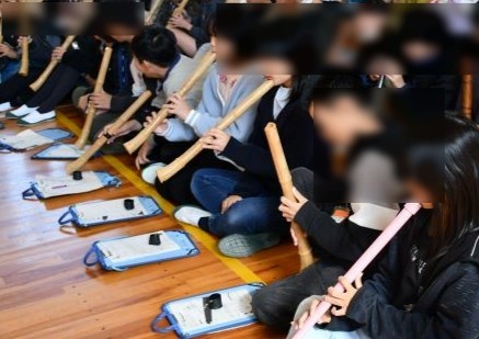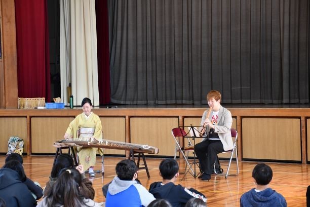 11月14日(金)に6年生が箏体験を行いました。講師の先生方の演奏を聞いた後で2グループに分かれ、箏の体験と尺八の体験を行いました。箏体験では日本古来の楽曲である「さくら」を弾きました。吹き方が難しい尺八では、悪戦苦闘しながらも、多くの児童が音を出すことができました。日本の伝統文化に触れる貴重な体験となりました。
