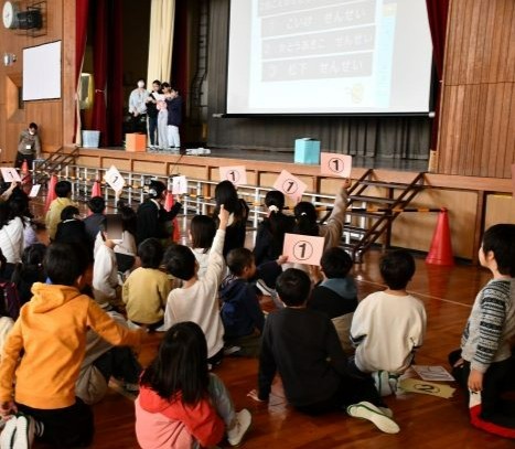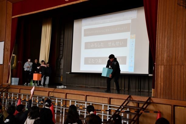 2月24日(火)、朝の「おはなか(おはよう・なかよし)タイム」に集会委員が企画した「先生クイズ」を行いました。全校児童が縦割りの班に分かれ、クイズに参加しました。身長・眼鏡・料理の写真などを見てどの先生のものかを考えたり、重い荷物を持っているのはどちらの先生かを班で予想して当てたりしました。カードで出した答えが正解になる度に一喜一憂して、楽しんでいました。集会委員がいつも工夫した企画で楽しませてくれるので、児童は毎回「おはなかタイム」を楽しみにしています。