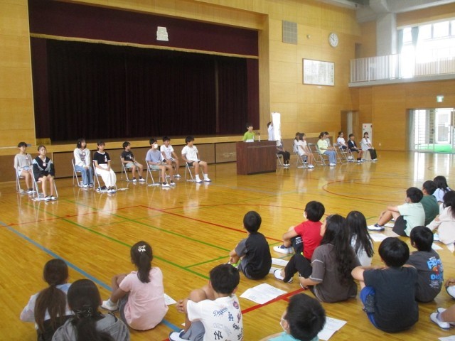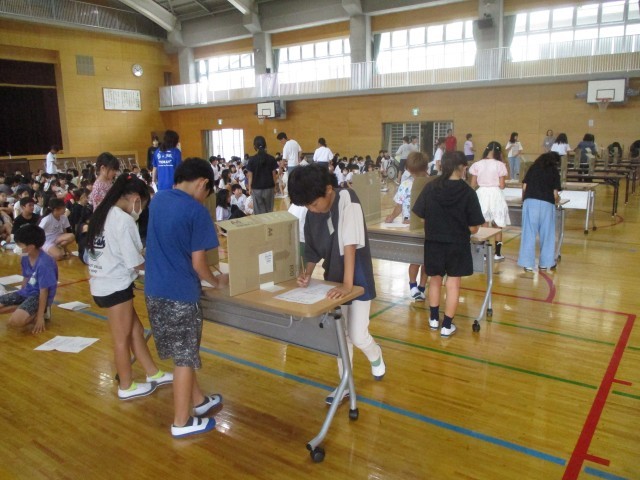 令和7年度後期児童会役員選挙が行われました。推薦責任者の言葉の後に、立候補の理由や当選後にやりたいことなどを堂々と演説することができました。今回は会場の後ろに投票所を設け、間仕切りや投票箱も設置するなど本当の選挙に近い形で実施しました。皆で兵庫小学校を盛り上げていってくれることを期待しています。