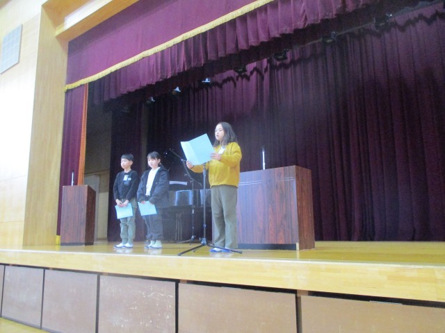 1月7日(水)に3学期始業式が行われました。はじめに4年生代表児童が、3学期に頑張りたいことを堂々と発表しました。校長先生からは、冬休みの振り返りと3学期に向けての話がありました。最後に元気な校歌が体育館に響きました。3学期も本校の教育活動へのご支援をよろしくお願いいたします。