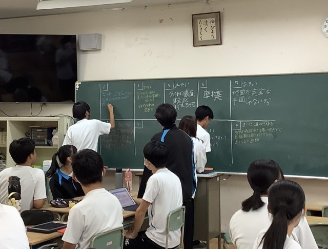 その後、テスト範囲でもあった「等速直線運動」についての問題を、班で話し合って答えを出しました。各班の代表者が、黒板に書きに出ました。別の角度から考えて答える面白い問いです。正解を確認して盛り上がりました。