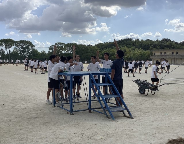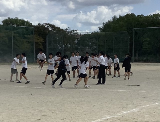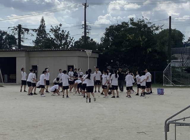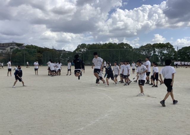 放課には体育祭の練習をする生徒で、運動場はいっぱいになります。9月30日、爽やかな晴天の下クラスで集まって、大縄跳びや玉入れ、クラスパフォーマンスなどの練習をしました。練習するたびに上手に縄を跳び越える人が増えていっています。クラスパフォーマンスでは大きな声を出して、体を動かしています。