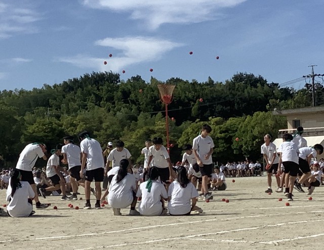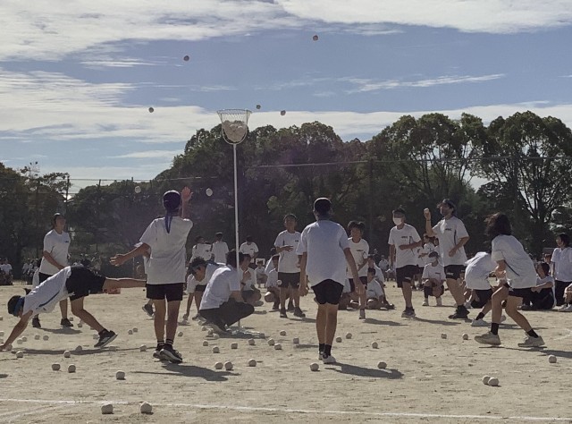 玉入れでは、ルール上遠くからしか投げられません。一度に何個も持ち、ふわりと狙って上手に投げます。溢れそうなほど入ったところもありました。